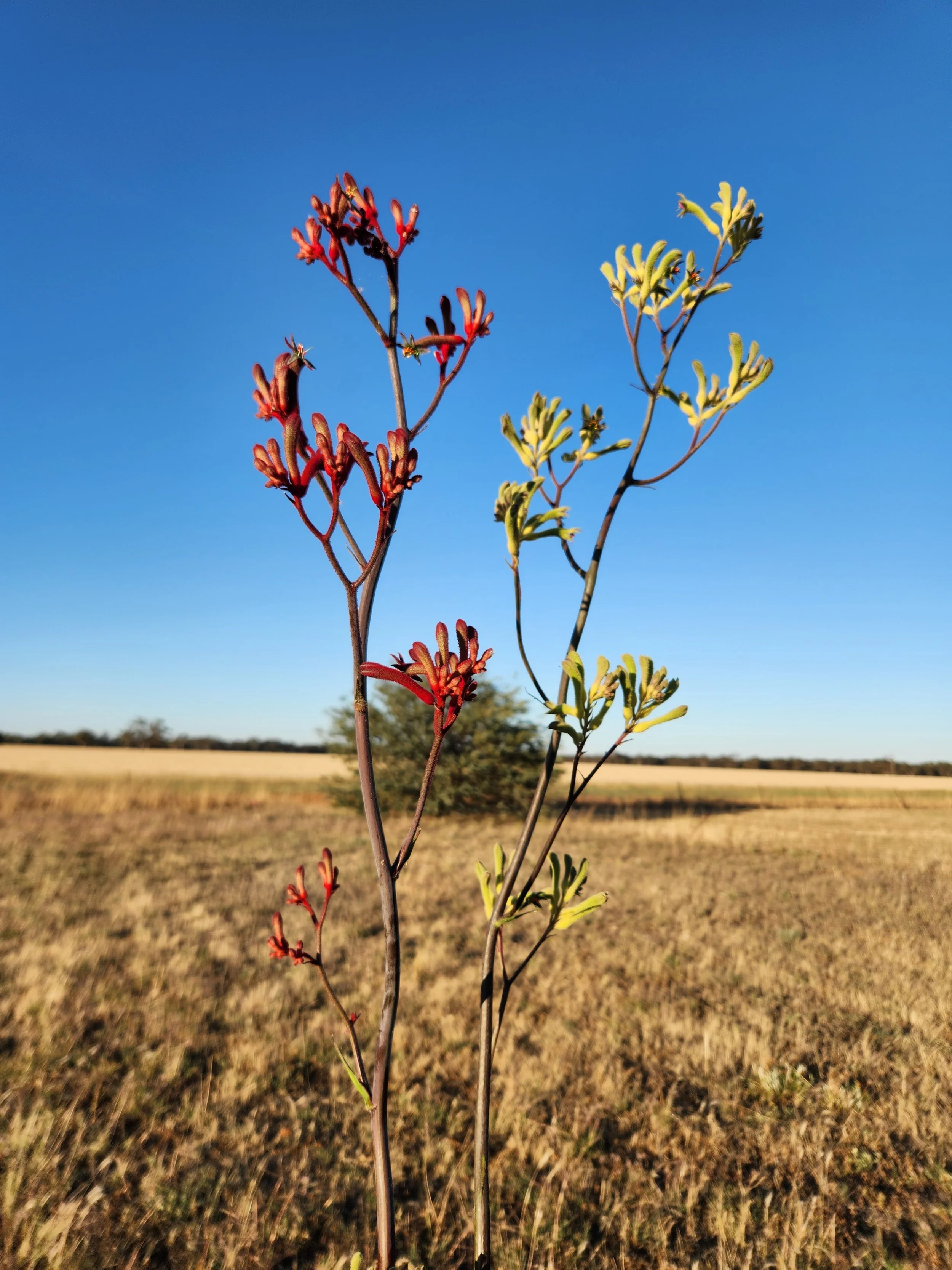 Red and green Kangaroo Paw, 1m tall.